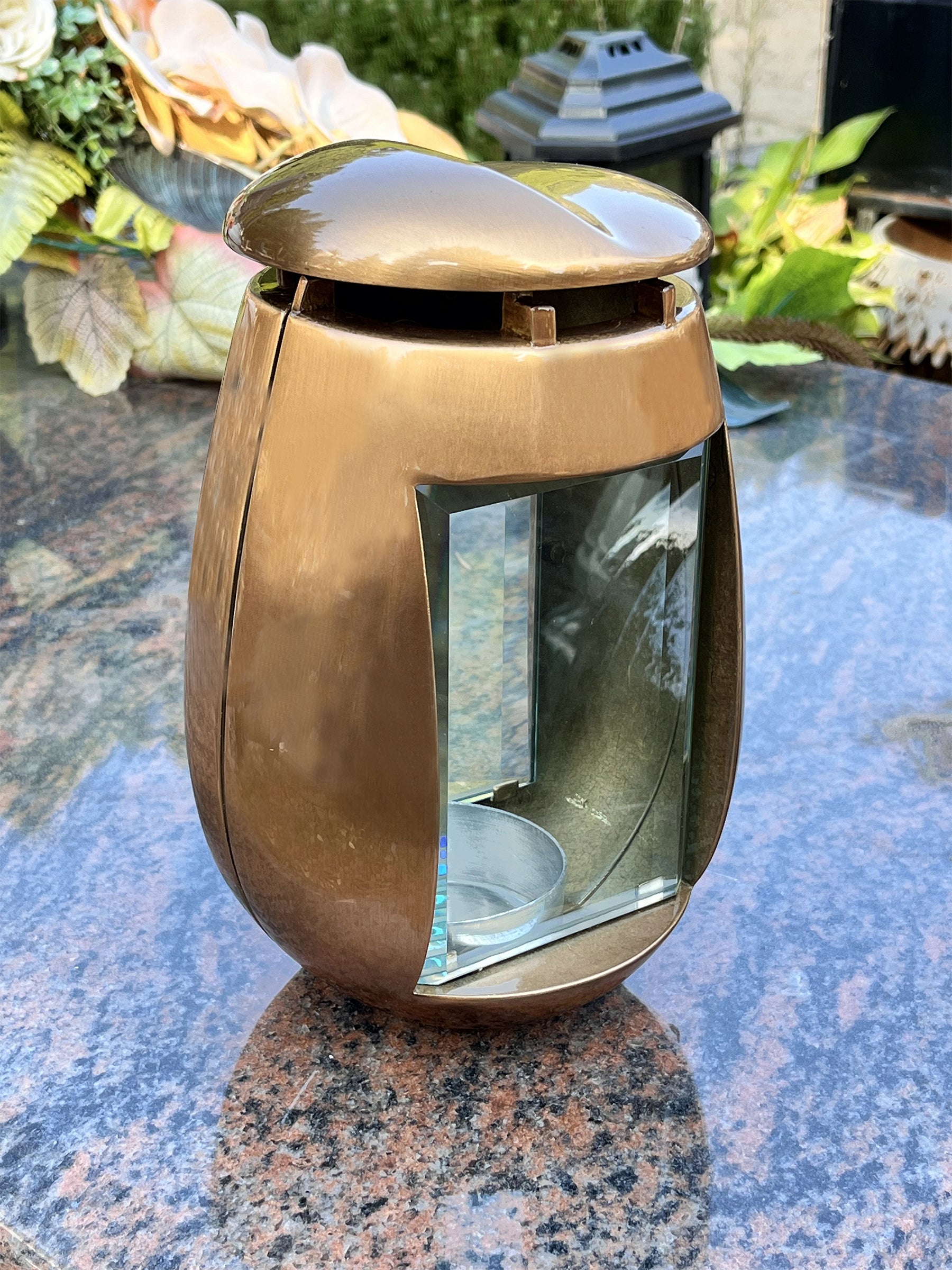 Stilvolle Grablaterne, Grabschmuck, Grablampe aus Messing